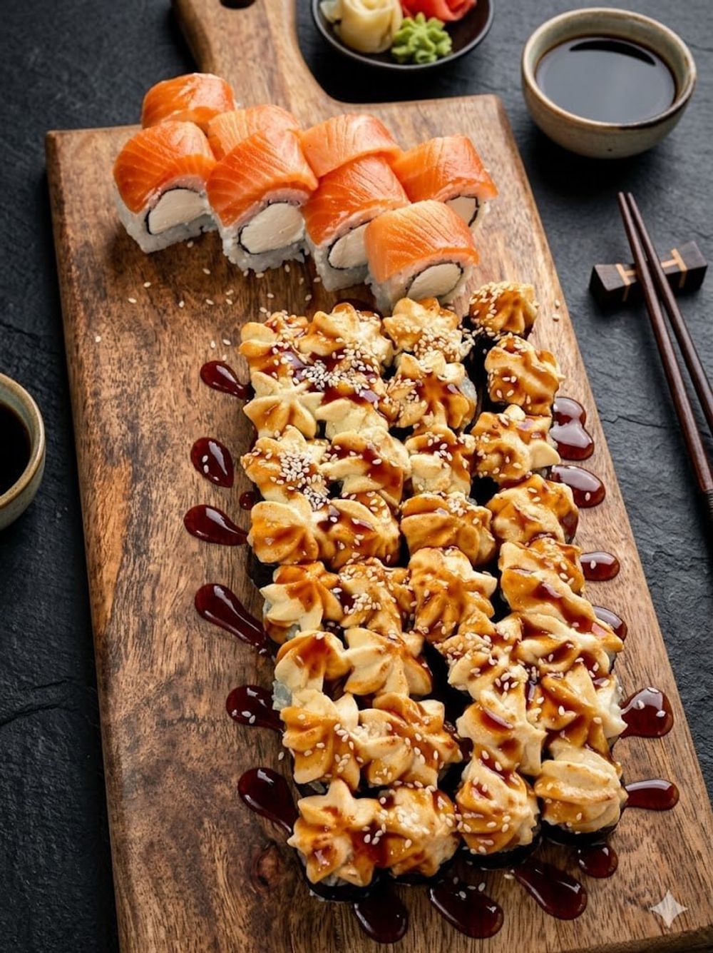 Запеченные мини с мидией (рис, нори, мидия, сырная шапка)