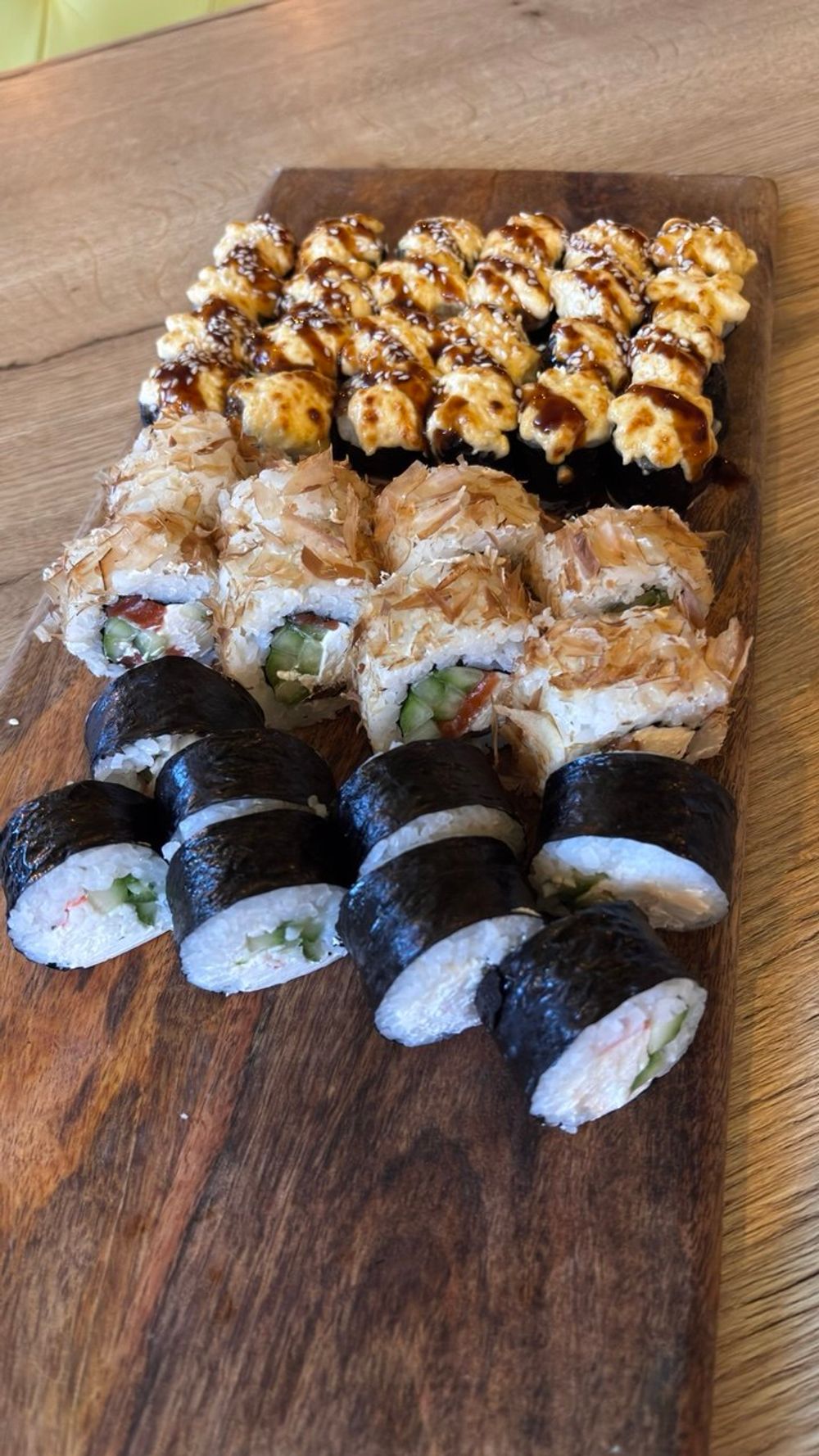 Запеченные мини с тунцом (рис, нори, тунец, сырная шапка)